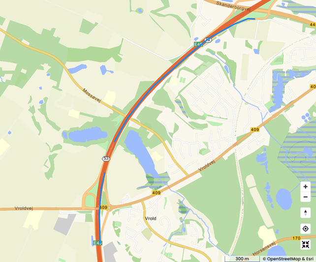 400 metres of the project is a noise barrier between the ramps at junction 53 Skanderborg S (Vrold) and 1.6 kilometres is the noise barrier between Vestermose at Mossøvej and junction 52 Skanderborg V.